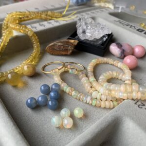 写真右上のマットな濃い色のビーズはナイジェリア産で、その他の石の産地は不明です。